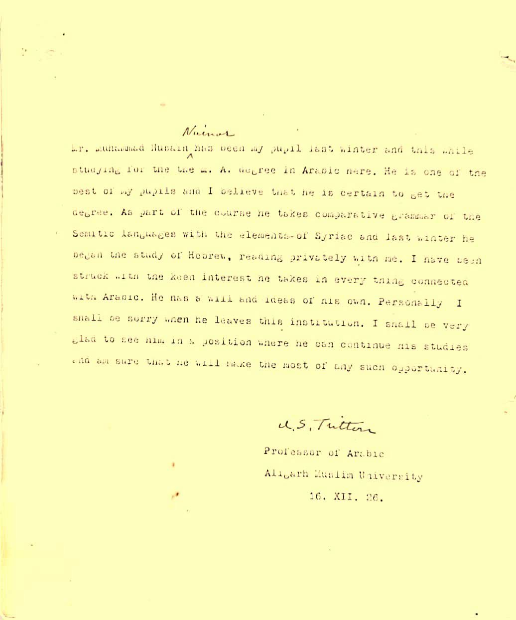 Among Dr. Hussain Nainar’s other tutors was British Arabist Arthur Stanley Tritton, who served at the AMU from 1921 to 1931. As the British scholar’s testimonial reveals, Dr. Hussain was no ordinary talent. “He is one of the best of my pupils, and I believe that he is certain to get the degree... I have been struck by the keen interest he takes in every thing connected with Arabic. He has a will and ideas of his own,” he writes, in a note dated December 16, 1926.